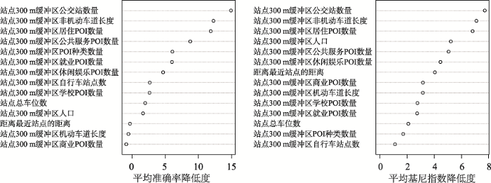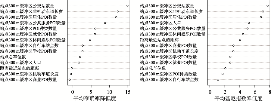自行车出行模式与站点属性和建成环境息息相关。利用随机森林提取出影响站点模式类别的特征变量和重要性程度。惠州惠城区市民使用公共自行车出行目的更为多元,包括通勤、短途办事、休闲娱乐、公交接驳等。在韶关市,影响站点使用模式的主要因素为通勤和通学,而不包含公交换乘。类似的,在某些中等城市如湖南株洲市,市民使用公共自行车作为整个行程的工具,而非公交换乘[31];而在诸如北京、杭州的大城市,公共自行车对其他公共交通系统同时起到补充和替代的作用[32,33]。在建设公共自行车系统前需要了解当地出行需求,针对不同地区差别化定位公共自行车的角色。