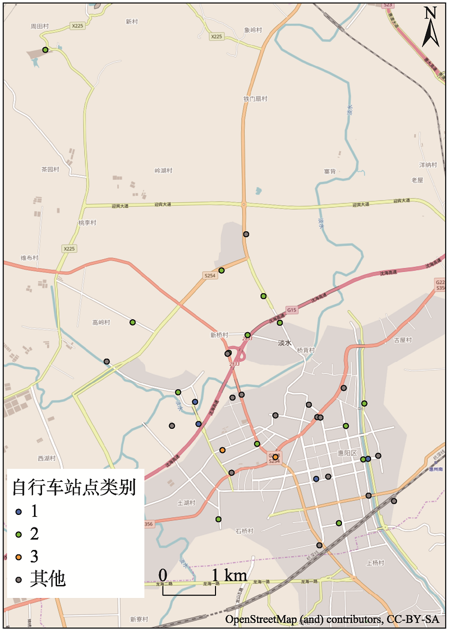 现有对于公共自行车的研究不足主要体现在 3个方面:① 研究区大多集中在欧洲大中城市、北美等地,中国区域研究主要关注杭州、北京等一线城市,缺乏对于欠发达地区的关注。中小城市发展空间紧凑、土地开发强度低,居民出行特征与发达城市会有所不同;② 国内对于公共自行车出行模式的研究有待大规模时空数据的进一步分析和佐证;③ 国内鲜有研究定量分析建成环境对于公共自行车使用行为的驱动机制。本文将对以上不足开展以下研究:选取广东省惠州市惠城区和惠阳区、韶关市区3个公共自行车系统作为研究对象,基于历史使用数据,挖掘全局使用情况,对站点使用模式进行识别并聚类,探索自行车出行的时空特征;利用随机森林算法检测站点使用模式的影响因素及其重要性程度;在研究结果的基础上,结合调研和规划文件,为城市规划和公共自行车部门提供政策依据,同时对城市用地布局和其他交通系统的规划与评估提供参考。