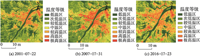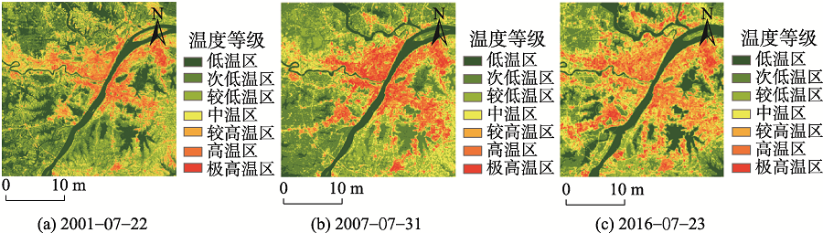 2001、2007和2016年城市热岛比例指数的计算结果分别为0.42、0.54、0.51,说明武汉市总体热岛效应程度先增加后减少。结合温度等级的时空分布,2001-2016年,以高温区为代表的城市热岛分布范围在不断扩大,从最开始集中于武昌、汉口、青山等中心城区和工业区,到最后延伸至城市周边的汉阳、江夏、光谷高新区等地。对于武昌、汉口等中心城区,在2007年时有大量高温区集聚分布,到2016年已大为减少,取而代之的是更多的中温区和较高温区;工业区中存在大量极高温区,一直是城市中热岛效应最为显著的区域,例如青山和沌口等地;一些城市新发展区(如江夏、汉南、东西湖区、光谷高新区等)自2007年开始也出现了集中连片的高温区,热岛效应不断增强。因此,武汉市工业区和城市周边新发展区的热环境情况不容乐观,但中心城区的热岛效应已经有所缓解,总体上城市热岛效应程度在2007年时最强,到2016年有所减弱。