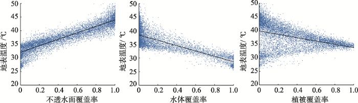 不透水面覆盖率、水体覆盖率和植被覆盖率与地表温度的多元线性回归模型及三者分别与地表温度的一元线性回归模型如表4所示,3个一元回归模型的可视化如图2所示。从表4结果可以很明显的看到,单将水体或是植被的覆盖率与地表温度进行一元线性回归,拟合系数