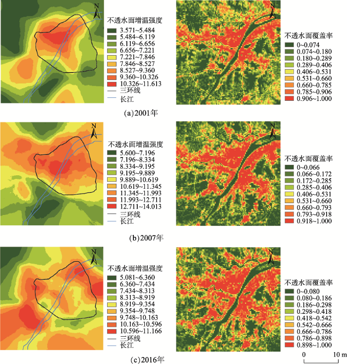 总的来看,武汉市中心城区的不透水面增温强度在不断减弱,城市周边新发展区域的不透水面增温强度在不断增加;强度较高区域的分布由原来单一集中于中心城区的“单中心”模式变为了分散集中于三环线附近地区的“多中心”模式,包围着中心城区。因此,武汉市在进行城市生态治理时应该结合不透水面覆盖率变化的趋势与特点,从局部尺度出发,重点考虑这些“多中心”地区与中心城区的生态空间协同发展。