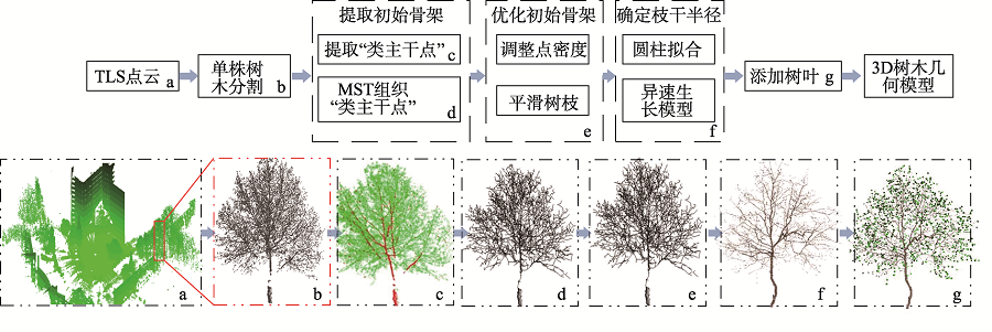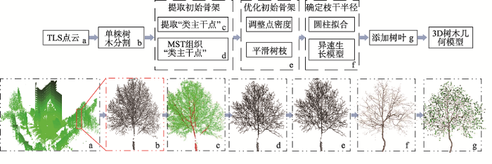 构建具有真实感的三维树木模型一直是计算机图形学、计算机视觉和遥感科学等领域研究的热点和难点问题。树木作为城市场景不可或缺的组成部分,精确重建三维树木模型有助于增强城市场景真实感,深化对城市场景的理解和认知。具有真实感的三维树木模型也是网络虚拟场景中最具有代表性的自然景观模型,其被广泛地应用于虚拟旅游、虚拟城市和虚拟生态景观模拟等领域[1]。另外,三维树木模型往往也是植被生态结构参数提取和反演的基础,定量化地描述树高、胸径、密度、蓄积量、碳储量和森林木材体积,甚至评估森林生态结构健康状况[2,3],都离不开三维树木几何模型的支持。地基式激光扫描(Terrestrial Laser Scanning,TLS)技术能够高密度、高精度地获取大面积树木的三维坐标和反射强度等信息,详细刻画树木的三维空间结构,为三维树木的几何重建提供了绝佳的遥感数据源[4],其被广泛应用于古建筑测量、遗产与文物保护、地质研究、建筑物施工、形变监测以及农林作物生长监测等领域[5]。基于上述背景,本文拟从含有噪声、离值点和数据缺失的TLS点云中重建高几何保真度和真实感的三维树木模型。