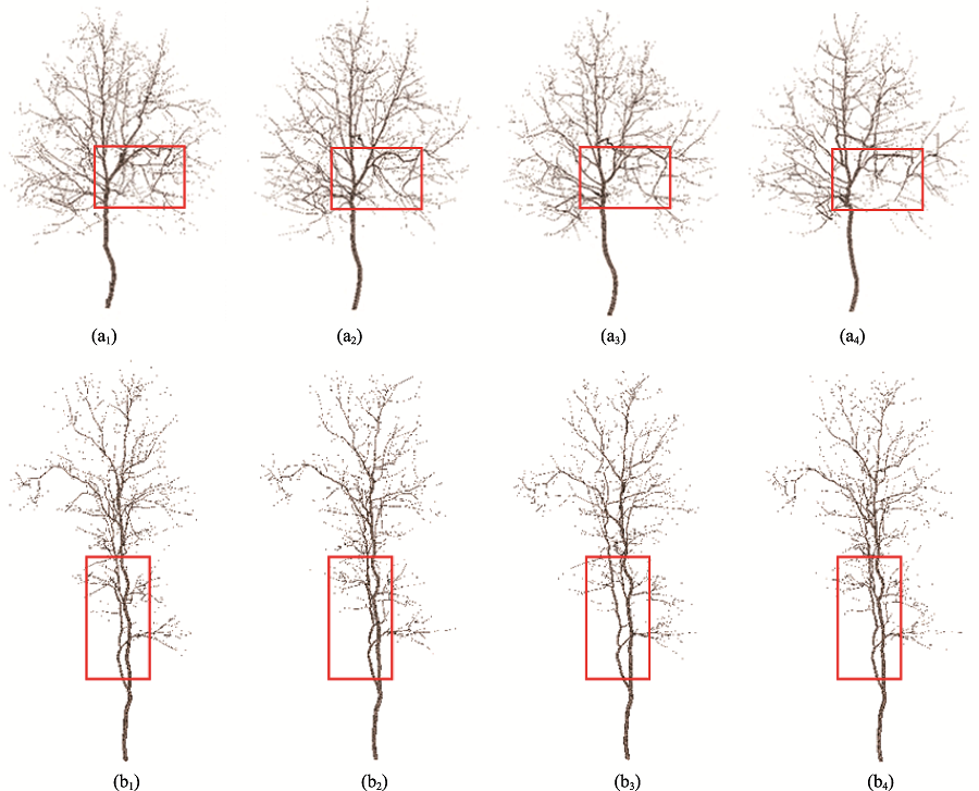 为了证明本文方法对点云密度有好的适应性,本文对原始树木点云随机抽稀重采样,用抽稀后的点云进行建模,以评价树木建模算法的鲁棒性。具体而言,采用原始树木点云的100%,70%,50%以及30%的点云进行建模,图9(见第247页)显示了不同点密度下两棵树建模结果。从图9可知,虽然点云密度差距较大,但是每组中4棵树模型的结构是相似的,主要细枝结构得到了很好的保持。虽然大量的点云移除会影响树木细枝的连接关系,如在红色矩形框内由于原始点云数量相对比较稀少,在随机抽稀后这部分点云数量急剧减少,甚至完全丢失,造成该区域连接关系发生变化,但是总体结构上的相似性,间接说明了本文方法对点密度的变化具有鲁棒性。需要说明的是,点云抽稀会影响点密度的计算,随着抽稀力度的增加,ε的取值相应的也要增加。本文中采用原始树木点云100%、70%、50%以及30%时对应的ε值分别设置为:0.1、0.2、0.3和0.5 m,可较好地平衡树木三维模型的抽象表达和树木模型的几何精度之间的关系。