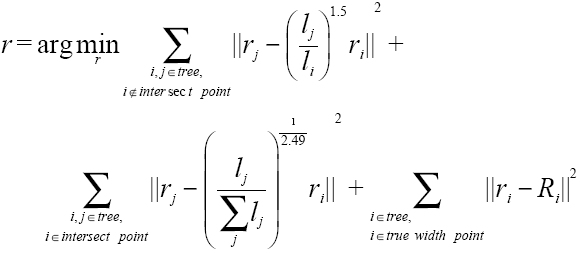 在现实中,如果点云扫描的质量较高,树干的半径可以用圆柱体拟合的方法来进行较为精确的估计,通过骨架结构上相邻2个点之间MST上所有点进行拟合。但是如果这些点分布不均匀,且存在大量噪声、离值点和数据缺失,采用圆柱体拟合难以获得良好的结果,此时“异速生长模型”则为估算树枝半径提供了一种替代方案。基于上述分析,本文结合“圆柱体拟合”和“异速生长模型”共同确定骨架结构上每一点对应的半径。具体而言,分别采用“圆柱体拟合”和“异速生长模型”计算构架结构上某一特点pi的半径,结果分别为ric和ria,然后检查ric是否满足如式(6),如果满足,则令ric为当前点 pi的真值半径。该过程计算完成后,本文采用式(7)[13]计算骨架上其它未知点的半径。该式用已知点的真值半径作为正则项,采用“异速生长模型”构建约束项,具体定义如下。