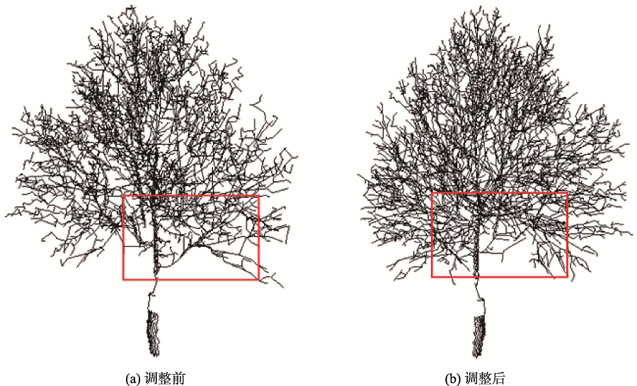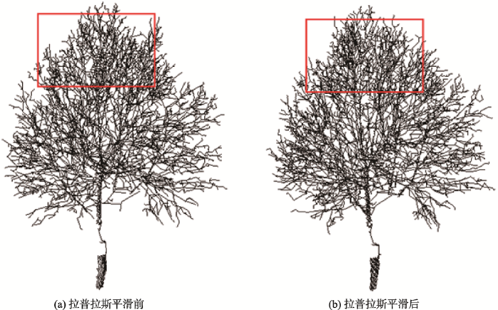 虽然图5(b)可以大体反映原始点云的宏观趋势,但与初始骨架的对比发现,不少细枝与主干的连接存在错误,需优化和调整初始骨架,从而更合理地反映树木细枝的连接拓扑。本文采用第2.2.3节点密度调整策略,消除一些连接错误的细枝。调整前后的结果如图6所示,调整后红色方框内的细枝分布更均匀。另外,实施拉普拉斯平滑操作后,树枝的伸展方式更自然,从而更符合真实场景中树枝的伸展方式。图7(a)为考虑点云密度后的优化结果,图7(b)为再次实施拉普拉斯平滑后的结果,图7(b)红色方框内的细节平滑后走势更自然。