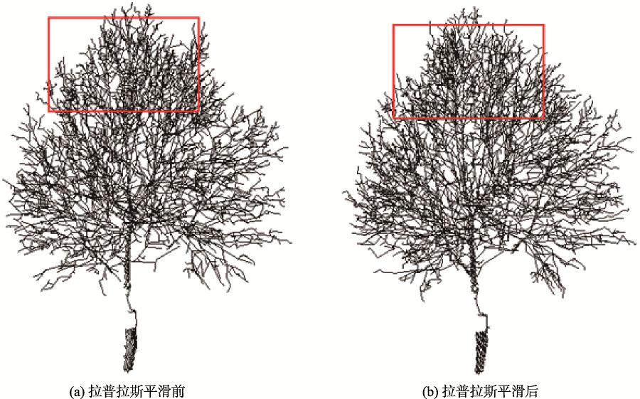 (2)树枝平滑。点密度调整以后树的骨架结构虽然得到了一定程度的调整,但是树枝的伸展方式并不自然,需要对这些树枝进行平滑,从而符合真实树枝的伸展方式。本文采用式(3)Laplacian方程对点云密度调整后的骨架进一步优化。