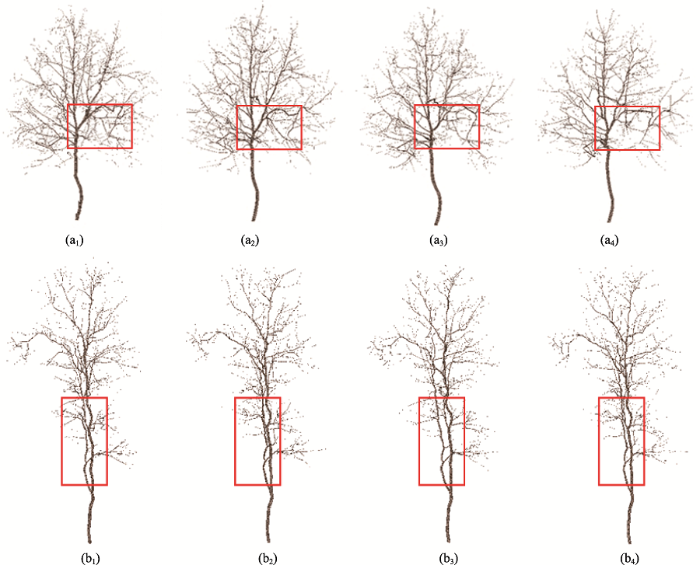 通过对骨架半径计算和添枝加叶后可得到完整的树木模型。如图8所示,对图4中裁剪的3棵不同树种的树木,构建三维树木模型。图8(a1)-图8(a4)所示树木位于南京林业大学教五楼正门前,整棵树点云基本完整,只在底部存在少量的数据缺失,这部分数据缺失是由于扫描时行人遮挡造成的。从视觉上重建的树模型和点云中的树基本一致,树枝的结构和伸展方式都得到了保持。虽然因为行人遮挡造成了一些轻微的点云缺失,但是基本没有影响整体的建模效果。图8(b1)- 图8(b4)树木位于南京林业大学图书馆后,整体建模效果较好,树木模型的伸展方式基本符合树木点云的伸展方式,由于该株树木的底部存在木棍的支撑,在建模时手动去掉木棍点云,因此在木棍交叉处的建模效果略有变形。图8(c1)-图8(c4)所示树木位于南京林业大学学术报告厅门前,整棵树点云基本完整,底部存在少量的数据缺失,但对树木模型构建的影响不大,从视觉上重建的树模型和点云中的树基本一致,树枝的结构和伸展方式都得到了保持。