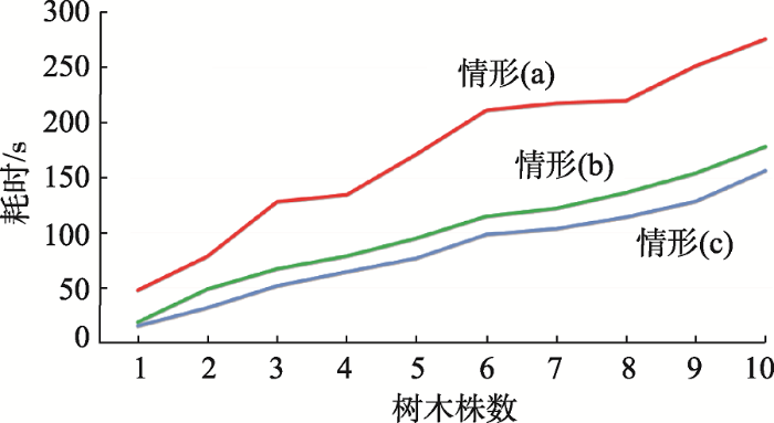 为了进一步验证本文算法的效率,从表3中任意选择10株树木,分3种情形评价建模算法的效率:情形(a):将单株树木的所有点都作为类主干点进行建模;情形(b):每株树木采用类主干点进行建模;情形(c):每株树木抽稀70%后,再进行类主干点建模。每种情形多株植被累加的计算时间如图10(见第247页)所示。图10中的耗时是在Release模式下,硬件配置为2.70 GHz Intel(R) Core(TM) i7-6820HQ CPU, 8 GB 内存,HD Graphics 530 GPU计算得到的。从图4可看出,类主干点优化相比原始点云植被建模,平均可提升约2倍的计算效率,在此基础上通过点云的抽稀可进一步提升计算效率,因此,基于结合类主干点骨架优化和点云抽稀的方法共同保证本文算法可以应用于处理大场景TLS植被点云数据。