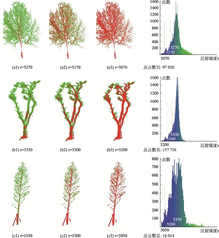 利用反射强度直方图找到使得反射强度分布产生近似跳跃变化的拐点,以此作为典型阈值τ下的类主干点。如图4,借助直方图的指导,展示了在不同阈值τ下3棵不同树种的树木“类主干点”的差异。3棵树木直方图都近似服从正态分布,比较理想τ值的选择,应处于正态分布的上升沿所处的微小区间内,具体的数值根据树种的不同略有差异。图4中每棵树种对应的直方图中,红线对应的阈值τ可以较好地描述树木的枝干,这些枝干点组成了MST构建树木骨架的基础,减少了“非主干点”对树木骨架构建的干扰。另外,基于“类主干点”重构树木三维模型也极大地缩减了参与运算的点云数量,提高了建模的效率。
