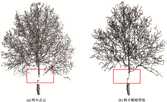 综上说述,基于树冠的建模主要基于数据驱动进行宏观的尺度的重建,不过多地关注单株树木细枝的连接方式和拓扑关系,该方法较适合处理ALS(Airborne Laser Scanning)和UAV(Unmanned Aerial Vehicle)树木点云。基于语法结构的建模属于模型驱动建模的范畴,枝干的生长往往受限于特定的语法规则,枝干之间具有无误差的拓扑关系,虽然视觉表现上具有较强的真实感,但是整体的树木几何精度较低。相比上述2种方法,基于骨架的建模方法也是基于数据驱动思想,可构建更精细、真实的树木模型,特别适合处理TLS或MLS(Mobile Laser Scanning)三维点云数据。如果事先可将点云中单株植被精细分割,则很容易将该方法扩展到处理大规模树木的重建。因此,本文提出一种树木骨架优化下的TLS三维树木建模方法,通过对骨架进行精确的提取和后续的优化,能处理点云的数据缺失,降低算法对点云密度的敏感性,提高树木建模的鲁棒性。