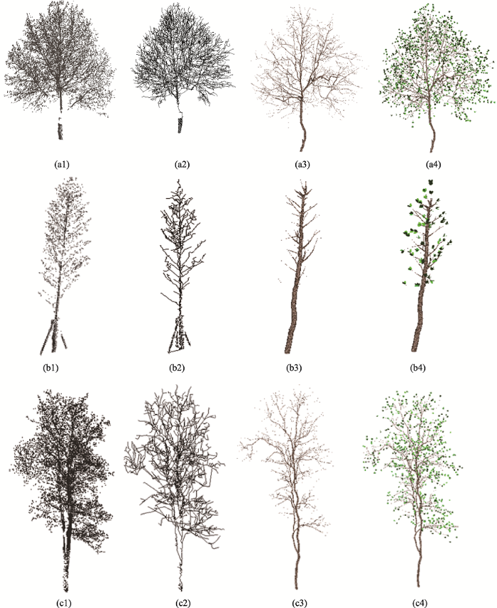 图8 3类树种的模型重建注:图(a1)-(c1)树的原始点云;图(a2)-(c2)树骨架;图(a3)-(c3)树模型;图(a4)-(c4)添加树叶的树木模型。