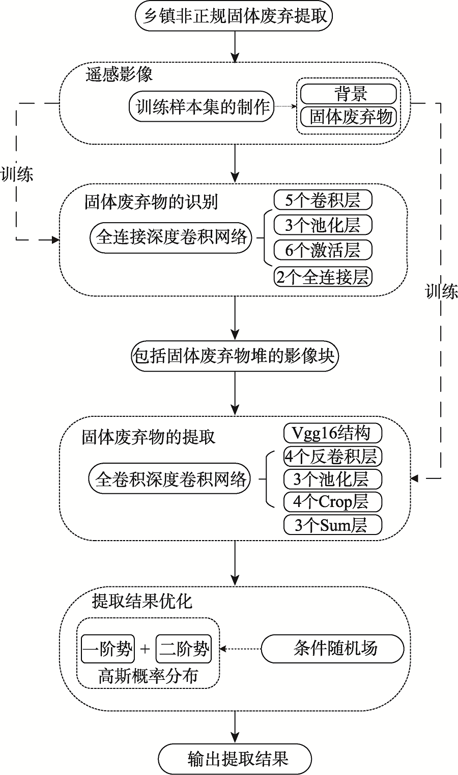 由于固体废弃物在整个影像上所占面积比例较小,结合高分辨率遥感影像与固体废弃物影像特点,为了提高效率,区别于传统分类方法,本研究首先利用CNN网络对包含固体废弃物的影像进行快速识别,筛选出感兴趣的区域,即被识别为固体废弃物的影像块,再利用FCN网络对感兴趣的影像块进行形状提取,从而节省整个网络的计算时间,提高网络工作效率。总体技术路线如图1所示,基于卷积神经网络与条件随机场的乡镇非正规固体废弃物堆的提取模型共分为4个:样本集的制作、固体废弃物的识别、固体废弃物的提取、基于条件随机场的结果优化。