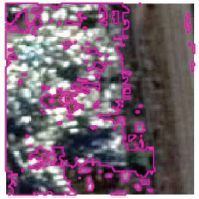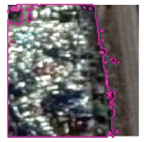 固体废弃物形状提取示例如表7所示。其中,SVM的分割结果易将影像中的固体废弃物与具有相似光谱特征的背景混淆,如示例1影像左侧边缘,示例3中把道路边沿分成固体废弃物,同时分类结果破碎;FCN分割结果相较于SVM结果,表面光滑,破碎较少;在FCN网络中引入CRF模型增加了上下文信息,利用像元之间的空间关系,过滤噪声的同时边缘细节信息增强,整体分类效果优于前2种方法。