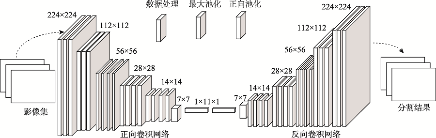 固体废弃物提取算法是基于全卷积神经网络进行影像分割来获取固体废弃物位置形状。全卷积神经网络(Fully Convolutional Networks, FCN,)可以接受任意尺寸的输入图像,利用反卷积层对最后一个卷积层的特征图进行上采样,使其恢复到输入图像相同的尺寸,从而可以得到对每个像元的一个预测标签,同时还保留了原始图像中的空间信息,最后通过上采样得到的特征图,进行逐像元的分类[16]。FCN网络与CNN网络都是通过卷积层和池化层得到影像特征,它与全连接神经网络的唯一区别就在于它把全连接层换成卷积层,通过反卷积和反池化操作将特征集直接还原到原始影像大小。