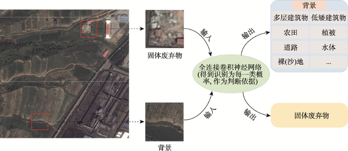 (1)基于全连接卷积网络实现固体废弃物堆的识别功能。通过卷积网络对每幅影像进行判断,识别出影像中感兴趣的固体废弃物影像块。识别固体废弃物的流程如图5所示。