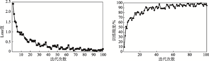实验中随机选取样本集中80%的数据作为训练样本,20%的数据作为验证样本,网络训练迭代数为100。最后的训练的Loss(损失函数)曲线和训练的精度曲线如图7所示,Loss曲线呈下降趋势,最终Loss值稳定在0.1左右,精度曲线呈上升趋势,精度最终稳定在96%以上。