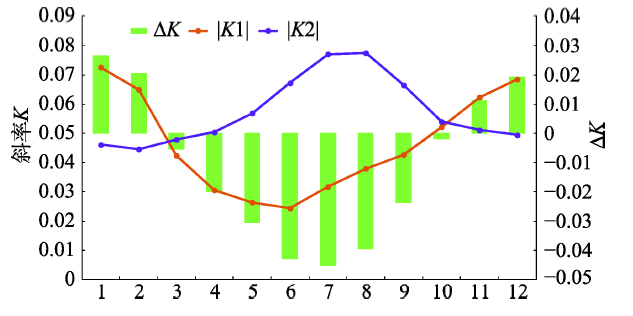 为了得到不同月份LST下降趋势发生变化的“FVC拐点”,以及拐点前后LST随着FVC变化的趋势,经多次试验获得最佳线性拟合方程和拐点(图10和表3),图10中|K1|代表拐点之前LST变化斜率的绝对值,|K2|代表拐点之后LST变化斜率的绝对值, ∆K代表拐点前后LST下降斜率K1与K2的差值。