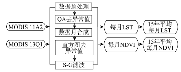 由于福建省常年多云多雨,所获得的MODIS数据会有一定程度的缺失。因此先基于常用的S-G算法[30,31]对福建省2001-2015年LST和NDVI数据集进行重构。重构之前的数据处理主要包括数据预处理、利用QA信息过滤质量差的像元、利用影像直方图去除异常值等,对重构之后的数据用平均值合成法生成每月平均LST,用最大值合成法生成每月平均NDVI等。具体流程见图2。