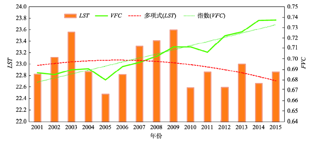 Fig. 5 Annual variation of LST and FVC of Fujian province from 2001 to 2015