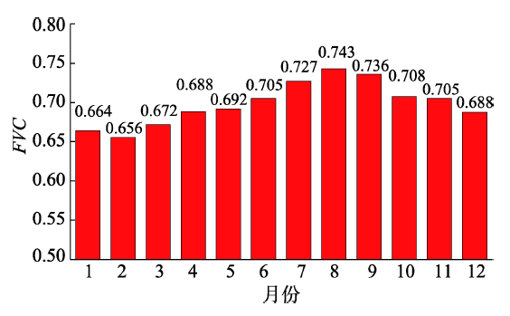福建省平均LST(2001-2015年)从1-7月依次递增,7月之后LST呈现逐渐递减趋势,夏季比较稳定,冬春季波动性较大(图6)。7月是福建省LST最热的月份,月平均LST达到29 °C左右,1月是LST最低的月份,月平均LST在15°C左右,年内平均最高温和最低温的温差为15 °C。福建省FVC从2-8月依次增加,其中5-8月FVC增加最快;8月之后FVC开始降低,一直持续到次年2月(图7)。8月FVC最高,为0.743;2月FVC最低,为0.656,FVC在夏季和冬季最大差值仅为0.087,说明福建省FVC即使在冬季仍处于较高水平。LST最高与FVC最高分别出现在7月和8月,年内的变化趋势并不完全同步,有一定的滞后性。