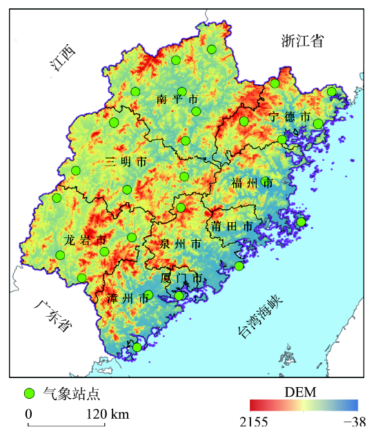 福建省西部和中部以占全省面积80%的山地丘陵为主,形成沿海岸线方向由东北-西南斜贯全省的闽西大山带和闽中大山带(图1),其中闽西大山带北高南低,长约530 km,平均海拔约1000 m。闽中大山带被闽江、九龙江截为三部分,其中山带中段的海拔最高,山体最宽。在东部沿海地区,由于河海的交互堆积,地形以丘陵和平原为主,海拔高度在200 m以下。根据全国第八次森林资源清查通报[29],福建省森林面积801.27万hm2,森林蓄积60 796.15万m3;森林覆盖率65.95%,连续37年居全国首位。