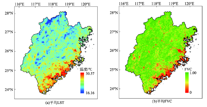 Fig. 4 Spatial distribution of average LST and FVC of 15 years of Fujian province from 2001 to 2015