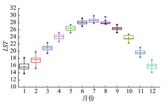 式中:LSTy表示y年年平均LST,LST(y, m)表示y年m月LST,y从1-15分别代表2001-2015年,m从1-12分别代表1-12月。
