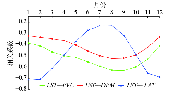 在一年之中LST与FVC、DEM和纬度(LAT)均成负相关关系(图8),且负相关随着月份变化呈现规律性的变化。FVC对LST的负相性一直处于较高状态,R绝对值介于0.4~0.7之间,其负相关作用虽然从1-8月逐月增加,9-12月逐月降低,但即使在最低的月份,其负相关性也大于0.4。从相关性变化规律来看,夏季FVC对LST的影响较大,其次是DEM,纬度对LST的负相关性几乎可以忽略不计;冬季纬度对LST的影响较大,其次是FVC。总体上FVC对LST变化的影响全年都处于较高状态。