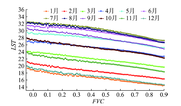 LST随着FVC的增加而降低,但降低趋势在不同月份有明显不同(图9)。在FVC与LST相关性较高的夏季,LST随着FVC的增加呈现“先慢后快”的降低趋势;而在FVC与LST相关性较低的冬季,LST降低趋势随着FVC的增加“先快后慢”。显然LST随着FVC的增加而下降的趋势有一个较明显变化的“FVC拐点”,在拐点前后LST随着FVC的增加呈现两种不同程度的下降趋势。