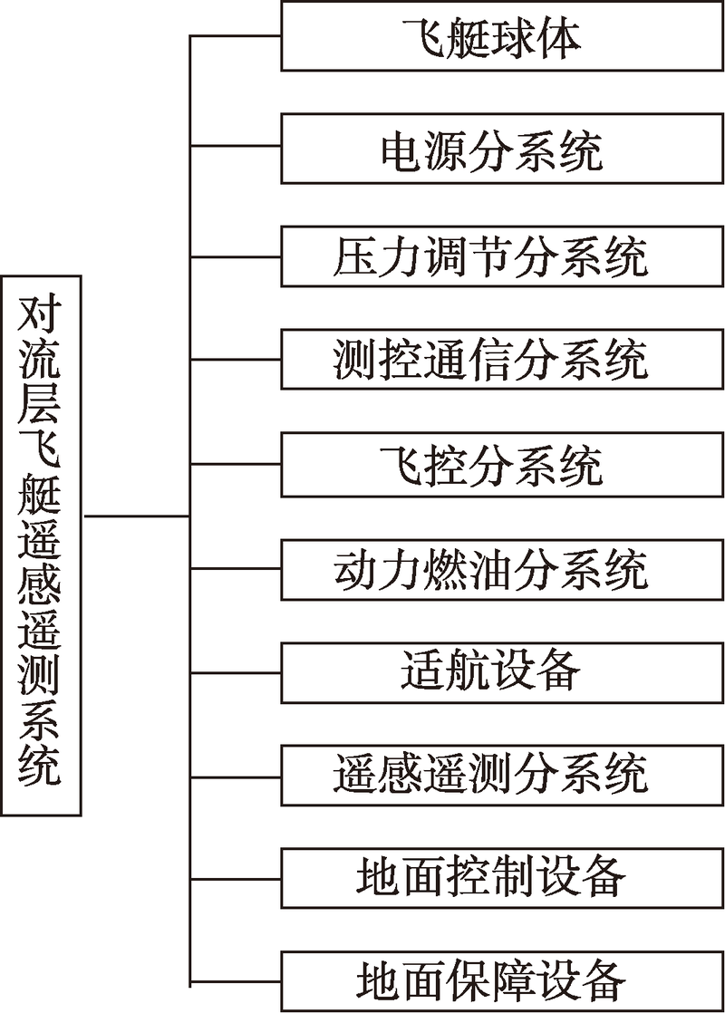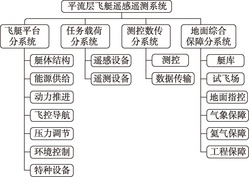 浮空器是一种廉价的、操作简单的航空遥感平台,可携带各种相机、红外辐射计等多种遥感传感器,早在1858年,法国人就开始用气球进行航空摄影[3]。按飞行高度,遥感应用的浮空器可分为中低空浮空器和高空浮空器两类。凡是在对流层工作的都属于中低空浮空器,其中大多数是可在空中某固定区域上空进行人工操作的飞艇,最高可升至地面上空8 km处,其组成如图3所示,典型工作方式包括地面组装、地面系留维护、升空巡航和拆收存储等;凡是进入到平流层工作均称为高空浮空器,它们大多是平流层飞艇,可升至20~40 km高空,其组成主要包括飞艇平台、任务载荷、测控数传和地面综合保障4大分系统(图4),其中飞艇平台分系统主要用于保障平流层飞艇的基本飞行状态,遥感遥测设备位于任务载荷分系统内,典型工作方式包括地面组装、地面系留维护、升空巡航和拆收存储等。经统计,目前在中国应用最广泛的浮空器遥感平台是中低空飞艇和平流层飞艇2大类。