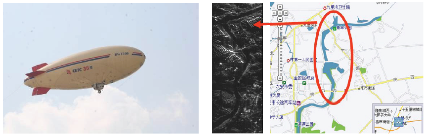 2007年,中国电子科技集团38所在安徽省六安市试验场利用BWT-300低空飞艇搭载自研的SAR设备,开展了高分辨率宽幅成像模式、GMTI模式、InSAR模式、方位向摆扫成像模式试验(图5),获取大量低空遥感数据[16],该飞艇的主要性能参数如表1所示。