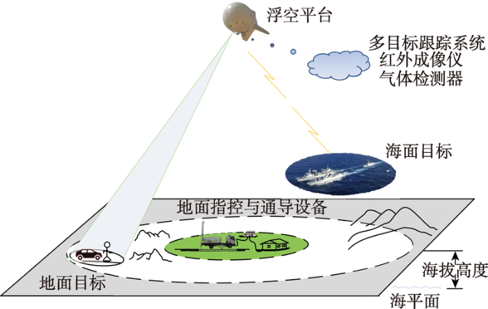 平流层飞艇工作在20 km以上高度(图6),能够克服地面地球曲率的限制和地形的遮蔽,具有升空高度高、视距远、覆盖范围大、效费比高、起降条件要求低、技术保障简便等特点,具备几个月甚至长达数年的高空定点留空和机动能力,基本不需要地面补给保障。因此,平流层飞艇可以执行区域高空地理资料长时收集的任务,能实现大范围、指定高度、大批量数据的长达数天,甚者数月的探测,解决现有遥感探测手段无法实现长时定点探测的不足。