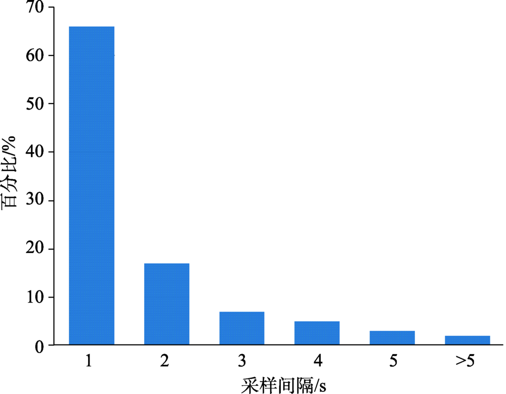 实验数据来自于某商城2天的移动对象蓝牙定位数据,有效轨迹约4000条,总轨迹点逾400万个,数据采样间隔1~10 s不等,如图11所示,采样间隔为1~2 s的轨迹点占比80%以上,数据定位精度为2~3 m,数据包括用户设备编号、定位时间、x坐标、y坐标及所在楼层编号5个字段(表1)。