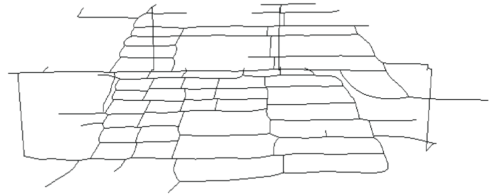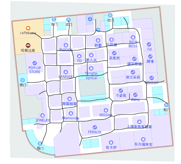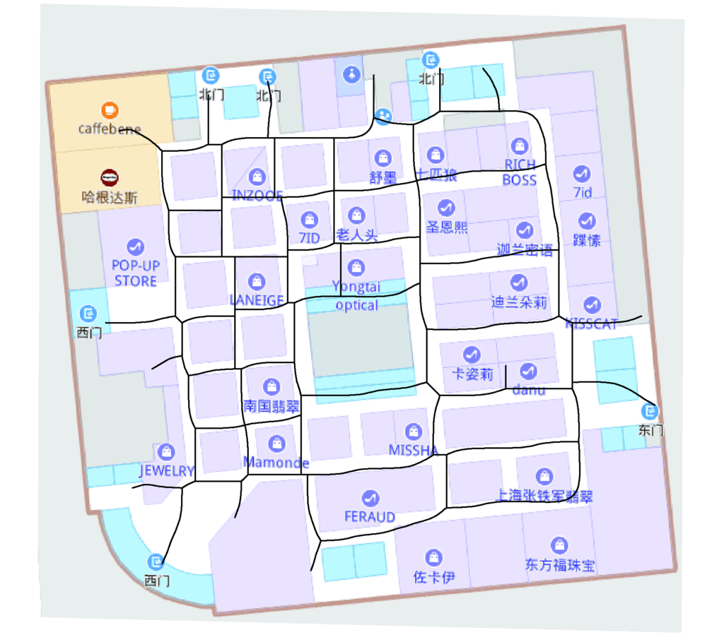 最后将室内轨迹图像细化结果转换成矢量数据就得到了室内导航网络,矢量化过程中需要考虑细化结果残留噪声、细化后的道路细碎分支、矢量道路平滑等,实现噪声和细碎道路过滤、路段平滑等。