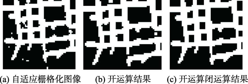 改进KNN自适应栅格化得到的室内轨迹图像连通性较好,但仍存在一些残留噪声、道路轻微裂隙、边缘锯齿等现象,这些会影响室内导航网络提取精度,需要对图像进行优化。本文采用数学形态学基本运算对室内轨迹图像进行优化,包括腐蚀、膨胀、开运算、闭运算等,在室内轨迹图像优化处理过程中通过结合多种运算以达到理想效果。