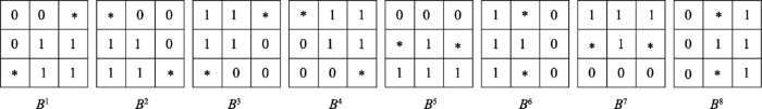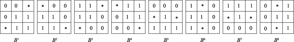 本文采用数学形态学细化算法对室内轨迹图像进行细化。数学形态学细化算法利用击中击不中变换,通过一系列结构元素对图像迭代细化,不断删除被击中的像素,直到结果不再变化,使用结构元素B对图像A细化处理定义为: