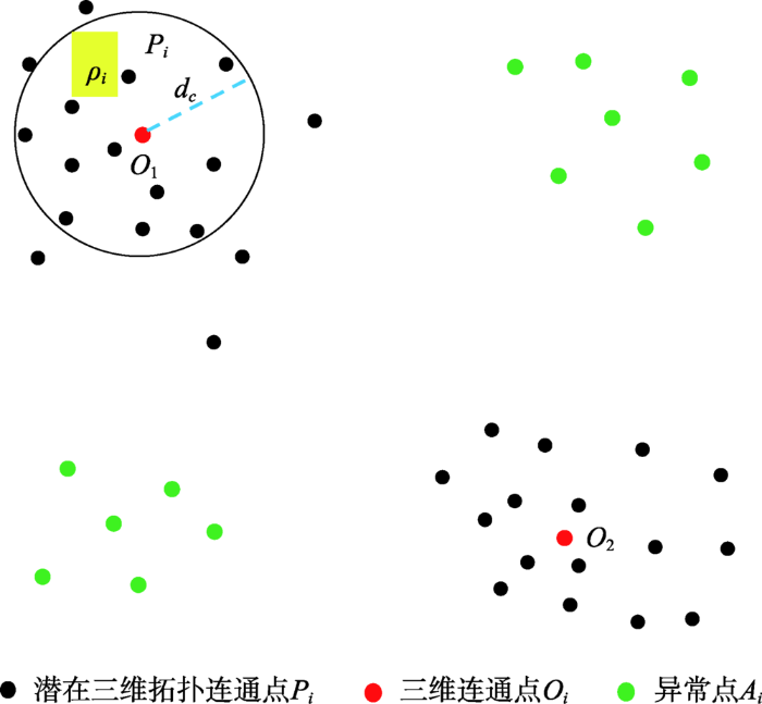 CFSFDP(Clustering by Fast Search and Find of Density Peaks)算法[19]是一种结合基于密度和基于划分的新颖聚类算法,该算法的核心思想在于聚类中心的刻画,且仅需指定一个参数即截断距离dc,即可自动生成聚类中心的个数及位置。聚类中心同时具有两个特点,与本文楼层连通点识别思想不谋而合:① 局部密度最大,被不超过自身密度的邻居点包围;② 与局部密度更大的样本点之间的距离相对较大。另外,定位误差的存在会导致道路上而非楼层连通区域的轨迹点也存在层间跳跃的情况,产生异常点。由于CFSFDP算法在识别过程中对密度敏感,因此具有良好的抗噪性能。因此本文采用CFSFDP算法从楼层连通区域中识别出楼层连通点。