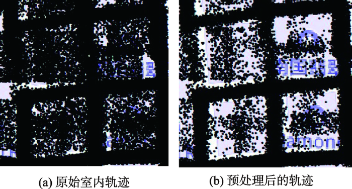 目前,基于移动对象轨迹数据构建导航网络的研究多集中在室外空间,依据方法模型的不同,分为轨迹聚类法、增量融合法、节点连接法、栅格化法等。轨迹聚类法[6,7]是基于同一路段轨迹具有的空间相似性和邻近性,运用聚类算法对轨迹点、线聚类,实现路网提取。增量融合法[8,9,10]首先初始化空白地图,逐次将车辆轨迹线添加进空的道路地图上,逐步构造和细化道路图。节点连接法[11]的关键在于交叉口识别[12],通常基于车辆轨迹在转弯处产生的速度和方向变化特征识别交叉口位置,通过节点连接形成路网地图。栅格化法[13,14,15]首先将轨迹点转换为二值化栅格图像,然后运用图像细化算法提取道路骨架线,最后生成矢量路网地图。