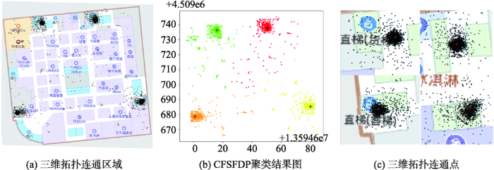 三维拓扑连通点需要采用聚类算法从步骤(1)识别出的分布于不同区域的三维拓扑连通区域中提取得到。此时,连通区域点密度越大,越接近楼层连通设施的实际位置。常见的基于划分的聚类算法(如K-Means)需事先指定聚类的个数,而楼层连通设施数量是未知的,限制了算法的使用;基于密度的聚类算法(如DBSCAN)在聚类过程中需要指定2个超参数,经验化程度较高,且得到的结果是聚类簇集,需要人为指定连通点的位置,通常取均值位置,均值通常会弱化轨迹点之间的密度差异,而将所有轨迹点同等对待,容易造成连通点位置偏移。