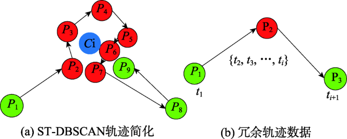 室内移动对象轨迹包含较多停留点信息,主要分为2种情形[16]:① 移动对象在同一位置停留较长时间,其轨迹会出现大量时间连续且位置不变的轨迹点;② 移动对象在一个位置及其周围游荡,其轨迹会出现小范围聚集,形成高密轨迹点簇。本文提出了基于ST-DBSCAN和轨迹速度信息的轨迹简化预处理方法,具体步骤为:首先利用ST-DBSCAN算法[17]识别出每条轨迹连续时间序列下形成的高密轨迹点簇,并以簇集质心