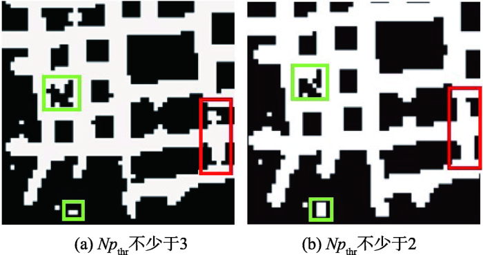 邻域像元构成的滑动窗口可根据拓扑不连通区域的面积大小自由调整,窗口边长不应超过研究区域最大路宽。若噪声多表现为连续的噪声像元,则可以增加邻域像元中不为0的像元个数,降低噪声像元被处理的概率。这种栅格化方法能够减弱栅格图像分辨率的选择对路网提取结果的影响,能够有效避免廊道轨迹密度差异而导致导航网络拓扑不连通的问题,同时能够较好的克服噪声的影响。