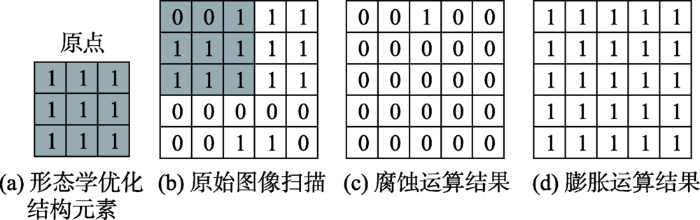 (1)去除噪声。噪声在室内轨迹图像里表现为大小不等的图斑,有的独立存在,有的与道路紧密粘连。去噪采用形态学腐蚀操作(式(3))实现,本文采用图6(a)所示的结构元素,记为B,其操作过程如下:在B中定义一个原点