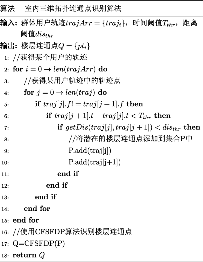 本文通过移动对象轨迹数据自动识别出楼层连通点,实现楼层自动连接,生成室内三维导航网络。首先基于化简后的用户轨迹识别出潜在三维拓扑连通区域,其次,从潜在连通区域识别出拓扑连通点,最后以连通点连接各楼层。具体步骤如下: