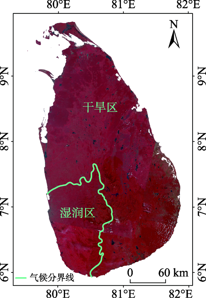 图1 斯里兰卡Landsat 8 OLI假彩色合成遥感影像(5、4、3波段)