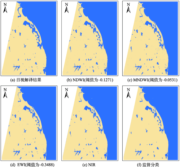 采用水体指数法(NDWI、MNDWI和EWI)、单波段阈值法(NIR)以及监督分类法(最大似然法)对两景实验影像进行水体的识别提取。利用水体指数法进行水体提取时,基于IDL 8.5平台编译的OTSU算法对3种指数法计算的图像进行自适应阈值t 的确定。选取2幅影像中湖库类型最多、最典型的部分,其目视解译结果如图2 (a)所示,5种方法水体提取的结果如图2 (b)-(f)。通过提取结果与影像叠加对比,并结合目视解译结果发现,基于OTSU算法的NDWI水体提取模型提取效果最好,能够准确地识别出湖泊、水库以及海洋的边界;基于OTSU算法的MNDWI水体提取模型存在一定的过提现象,将一些湿地识别为水体;基于OTSU算法的EWI水体提取模型对小面积的浅水存在一定的漏提现象;NIR算法对湖库等水体的边界提取不准确,同时存在明显的漏提现象;最大似然提取水体的结果最差,不能准确识别出水体边界,漏提和误提现象明显。
