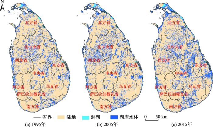 图4 1995、2005和2015年斯里兰卡湖库水体和潟湖分布