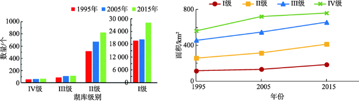 ... 通过图4 可以看出,1995-2015年斯里兰卡湖库水体面积总体呈增长的趋势,潟湖面积也呈现增加趋势,由于其不属于严格意义上的内陆淡水湖库,后面不计入相应的统计分析.经统计1995年斯里兰卡湖库水体总面积为1020.37 km2 ,2005年为1270.48 km2 ,2015年为1417.48 km2 .20年间,斯里兰卡湖库水体面积呈现大幅度的增长,增加了397.11 km2 .为了进一步分析全岛内陆湖库的时空变化,结合斯里兰卡湖库分布并参考文献[22 ,23 ] ,将湖库水体按面积分为如下4个等级:I级湖库(<0.1 km2 )、II级湖库(≥0.1~1 km2 之间)、III级湖库(≥1~5 km2 之间)和IV级湖库(≥5 km2 ).各年份不同类型湖库数量和面积如图5 所示,斯里兰卡9个省湖库总数量和面积统计结果如图6 所示. ...