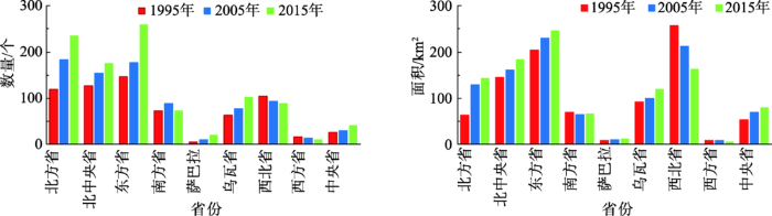 图5 1995、2005和2015年斯里兰卡湖库数量及面积统计