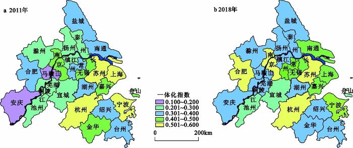 2011和2018年长三角城市群一体化指数空间分布