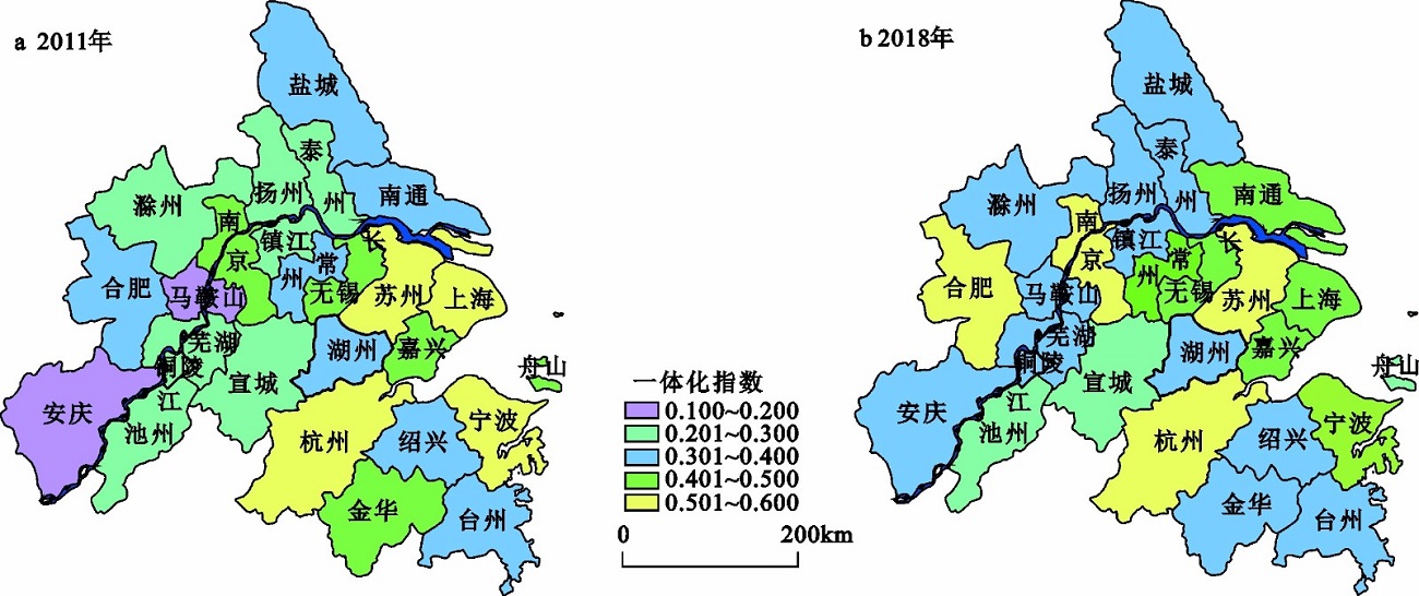 | 图1 2011和2018年长三角城市群一体化指数空间分布 |